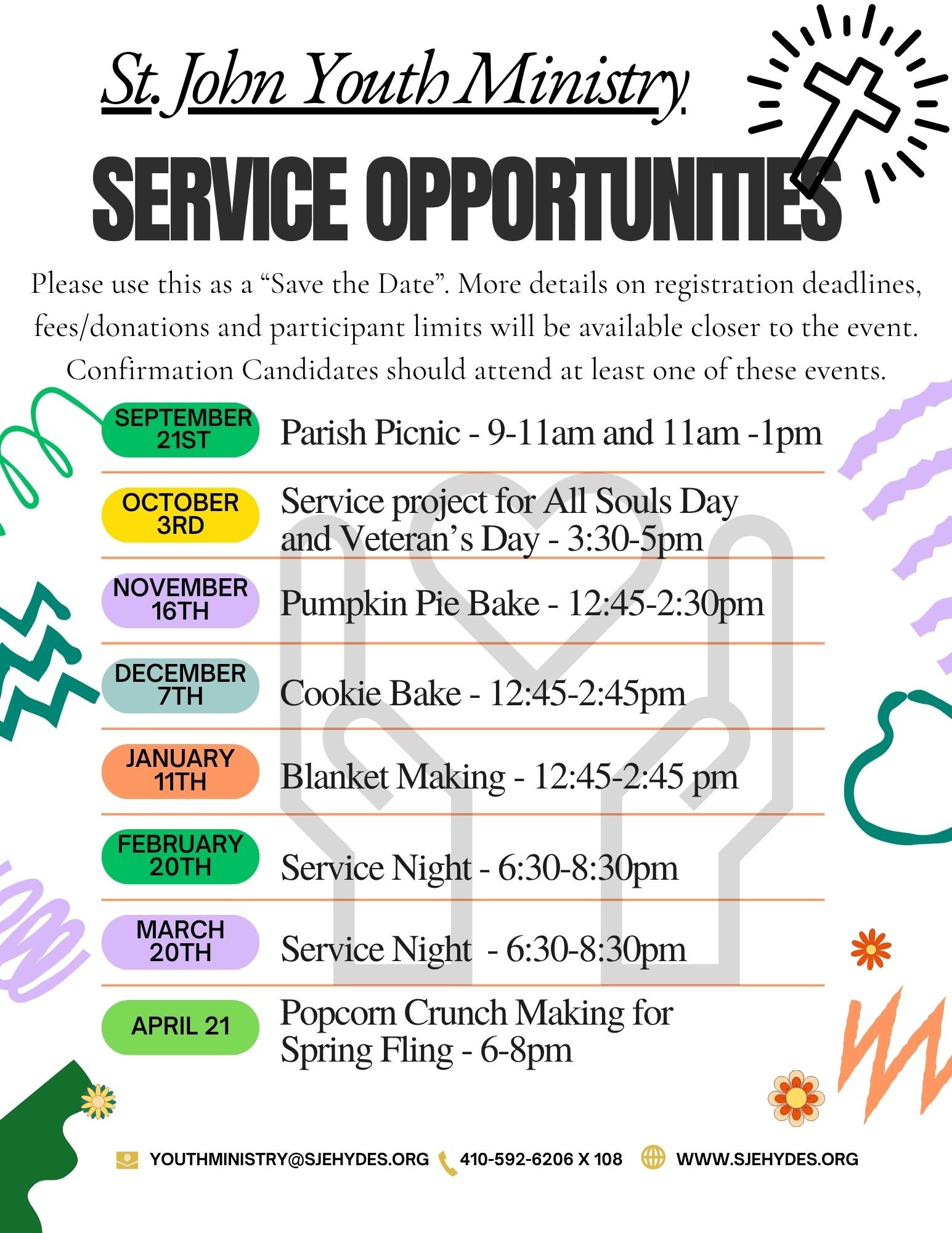 The Sacrament of Confirmation is offered to anyone currently in grades 6-12 who has a desire of heart to receive the sacrament and has already been baptized (or made a Profession of Faith) in the Catholic Church, and has received the sacraments of Reconciliation and Eucharist. Preparation takes place through the Youth Ministry program. For more information, please contact Colleen Sisolak at 410-592-6206, ext. 108 or email to: youthministry@sjehydes.org.