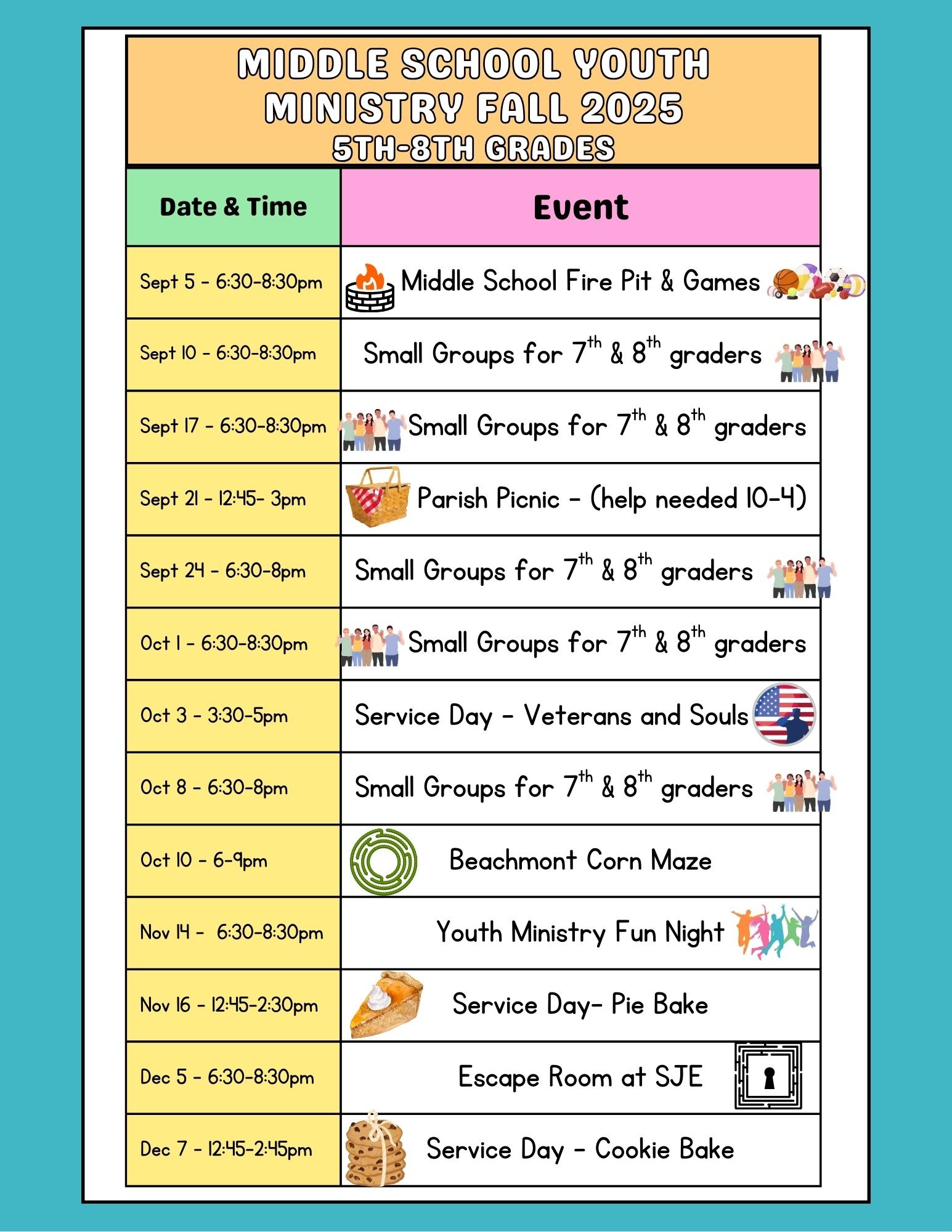 Click here for Youth Ministry Forms. Permission Slips are required. (1 for the 25-26 academic year for on campus events. Off campus events will have a form per event)